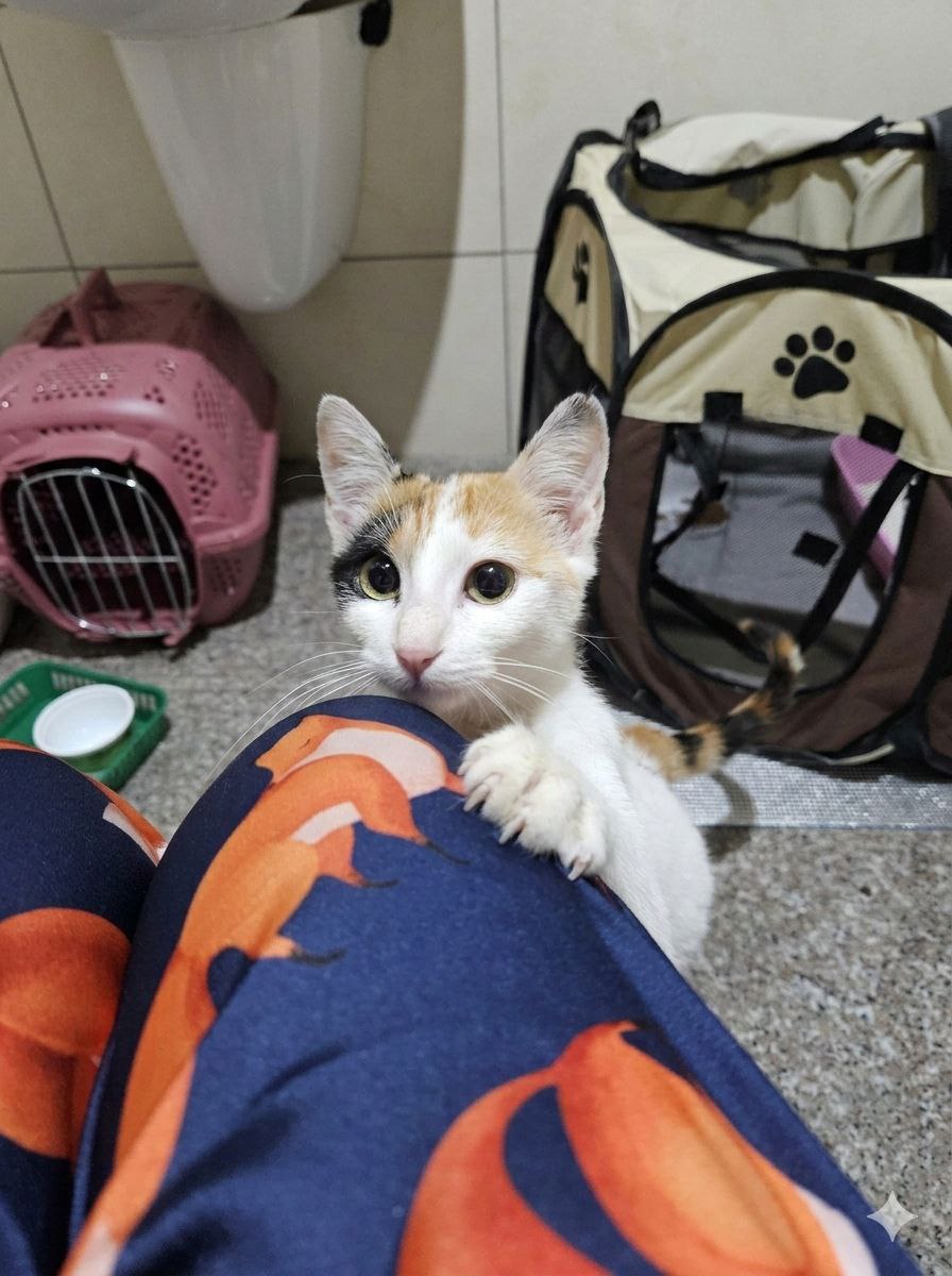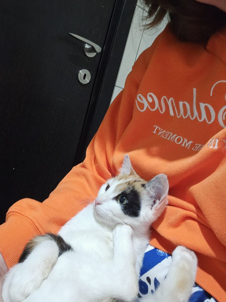 Поночка (временное имя) очень нежная, ласковая и любит быть рядом с человеком (постоянно мурчит). Но при этом она любопытная, отлично ладит с собаками (они хорошо уживаются с моей сиба ину) и в целом очень умная и смешная девочка.