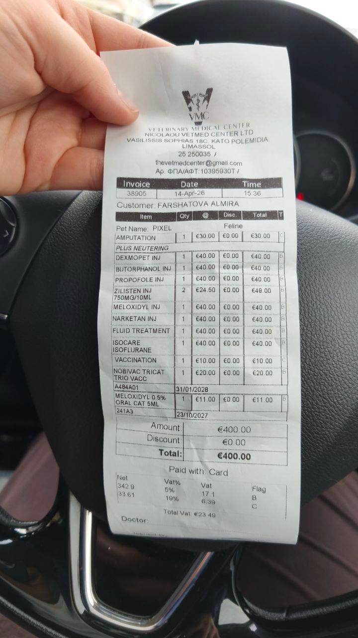 Счет в клинике VMC оплатила моя подруга, так как кот был записан на ее имя. Все подтверждения — счет и скриншот перевода — прикрепляю.