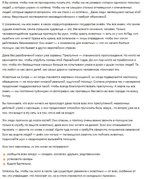 @sittsevaЯ ее лично не знаю, просто слежу за ней в твиттере. Что я знаю со стороны — она замужем за итальянцем, это их личный дом, они его построили специально но для большого количества животных, которых они спасают, у них собаки еще живут. Она спасает бездомных котов и отправляет их в новые семье в северной Европе, она говорила что именно туда, потому что там заключаются договор, где хозяева реально несут ответственность за животное. Я так понимаю она не частник, а как приют или организаци для помощи животных оформлена. Не знаю как она легально оформляла все это предприятие. Но она не похожа на человека, который мучает животных, она вроде бы наоборот спасает всех, а Киприоты с ней вот так отвратительно поступили, я так поняла ее это очень задело. Что там сейчас происходит я не знаю, она написала что там жопа, открыли дело.