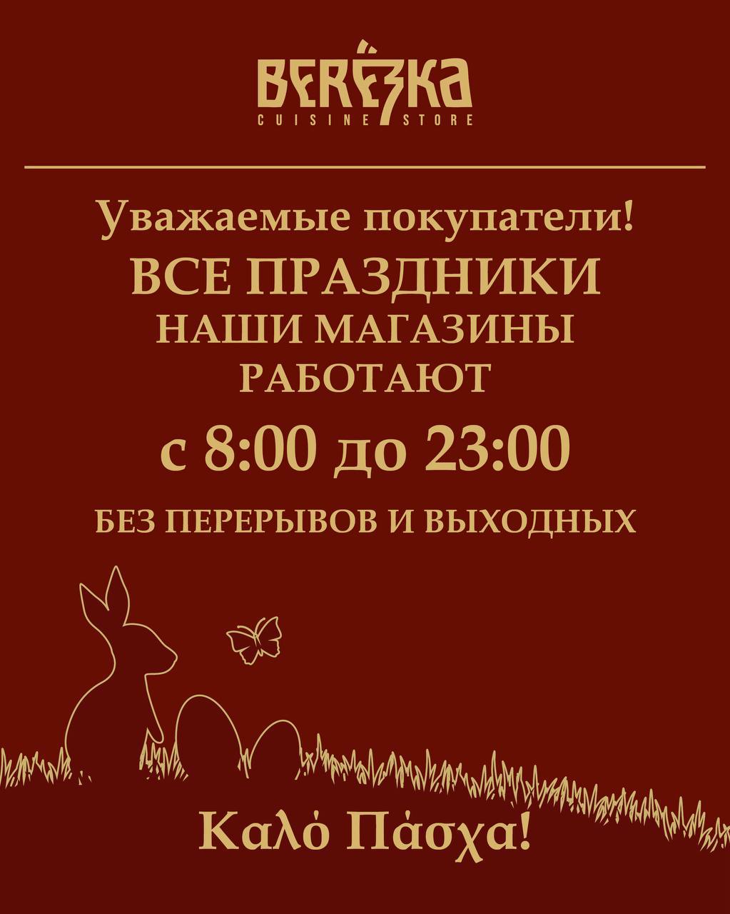 🐣 ГРАФИК РАБОТЫ МАГАЗИНОВ BEREZKA STORE & CUISINE В ПАСХАЛЬНЫЕ ПРАЗДНИКИ