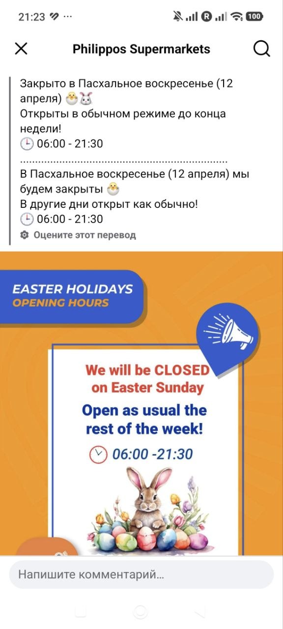 @ElenmalinНу вот написано что 13 апреля закрыты магазины..Филиппос вроде работает даже в праздники какие то..на всякий случай надо закупиться.