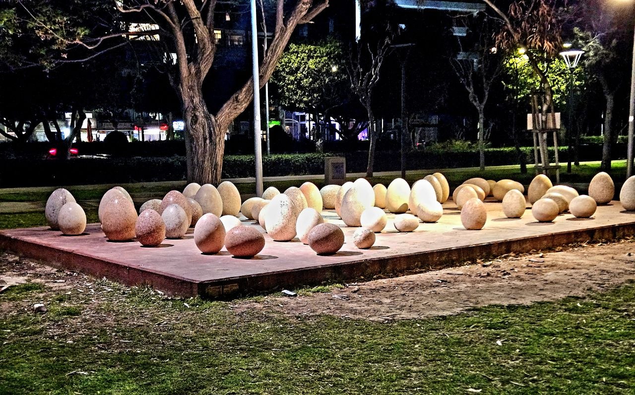 Это знаменитая инсталляция "Рождение" (греч. Γέννηση), но мы называем её "каменные яйца". Инсталляция представляет собой платформу, на которой размещены 96 яиц разного размера. Их число варьируется – композиция была задумана как интерактивная, но некоторые восприняли это буквально, и яйца стали пропадать время от времени. 🙈