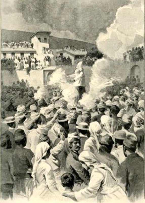 Затем, одновременно со взрывами фейерверков, вспыхивает стрельба, оживляющая его основание. Иуда наклоняется с огромной раной на глазу, с растрёпанной бородой, с открытым ртом, словно морщась от боли. Толпа обезумела от удовлетворения, искупая каждый удар, раздирающий идола. Опытный стрелок почти полностью отрубил голову, грудь пронзили, конечности сжались — и эта грубая конструкция раскрывает свою сущность.