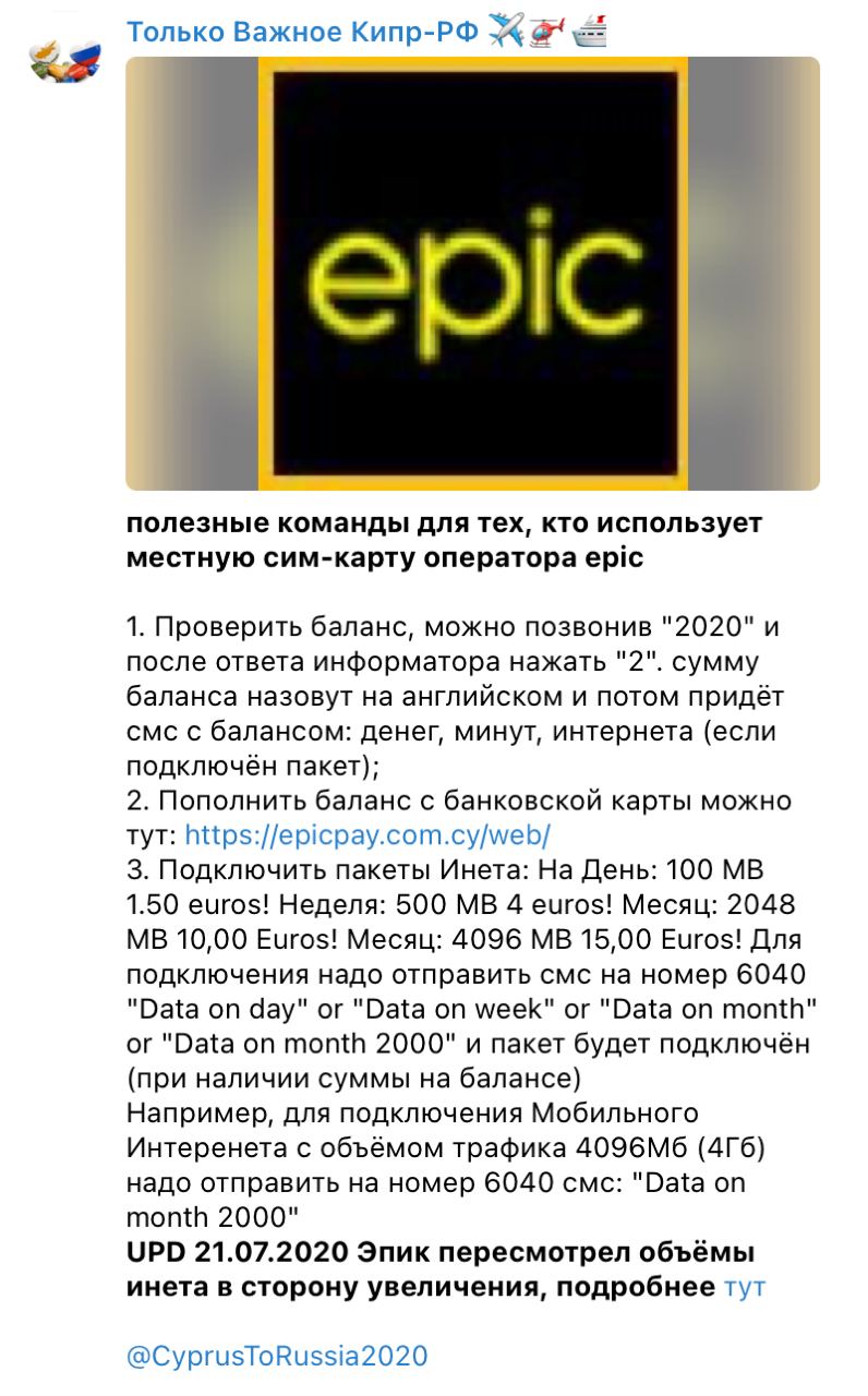 Здрасти! Возникла такая ситуация. Сейчас за пределами Кипра. Нужно пополнить Epic номер. Но без подключения к местной вышке это невозможно. Как пополнить теперь онлайн номер в инете? Кто знает? Есть сервисы (нагуглил), но ссыкотно вводить туда свой номер и другие данные..не официальные сервисы, так сказать.