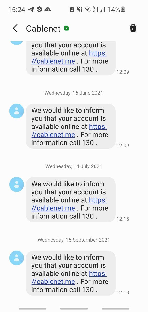 We would like to inform you that your account is available online at https://cablenet.me . For more information call 130 .