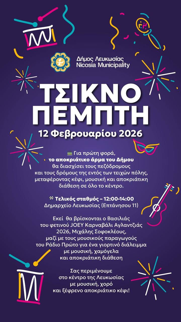 Карнавальное веселье начинается завтра, в 10:00, с музыкой и угощениями перед Eurobank (улица Гладстонос) и Bank of Cyprus (улица Агиу Андреу напротив церкви Агиа Напа);