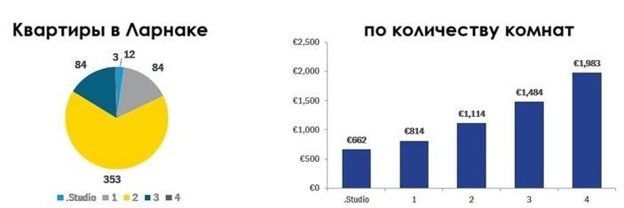 Ларнака располагается на третьем месте по количеству предлагаемых квартир и на втором по количеству домов: в городе свободно 536 квартир и 219 домов. Средняя стоимость аренды квартиры в месяц – 1120 евро, а дома – 2340 евро. Двухкомнатные квартиры составляют 65% рынка Ларнаки.