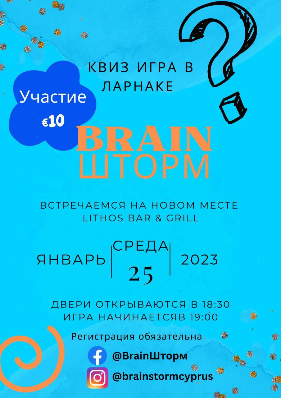 Всем привет! Приглашаем вас на следующую квиз-игру BrainШторм в ЛАРНАКЕ 25 Января! У нас вы не только приобретёте много новых знаний,взбодрите свои мозги и логику, но ещё и попадёте в позитивную атмосферу, приобретёте новых знакомых и отвлечетесь от повседневной суеты.
