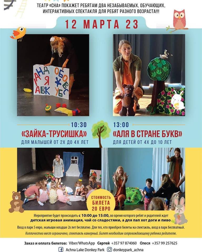 12 марта 2023 У нас в гостях на ФЕРМЕ Achna Lake Donkey Park театр "Сна" из города Рига покажет ребятам два незабываемых, обучающих, интерактивных спектакля: