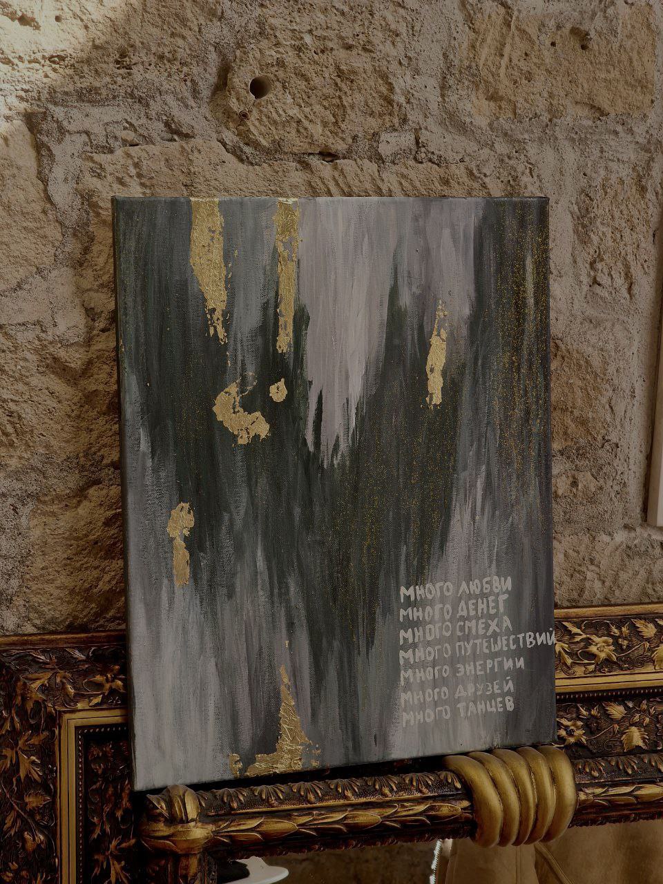 На мастер-классе будем писать свои картины акриловыми красками, а основной акцент будем делать на потали (поталь — имитация сусального золота) и на афирмациях 🔥