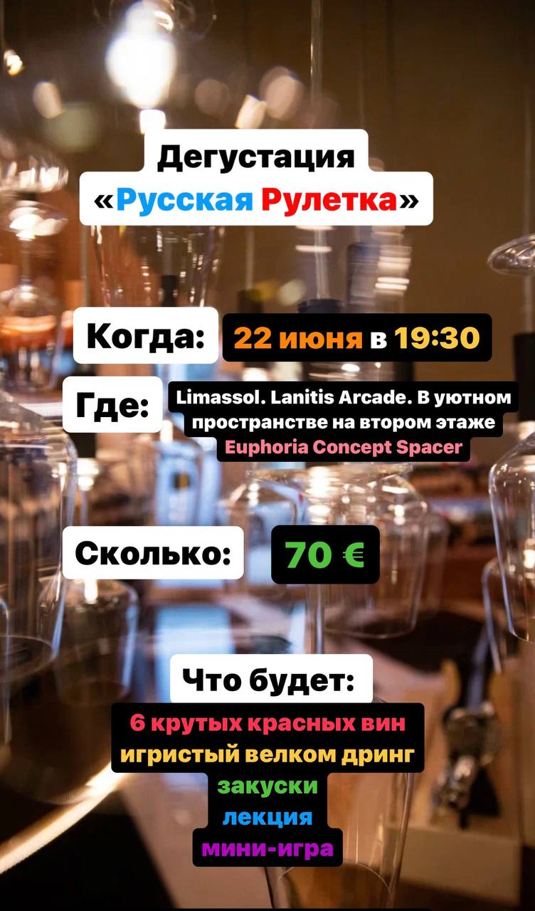 Хочу пригласить вас на мою авторскую дегустацию в Лимассоле 22 июня (чт) в 19:30, где мы с вами сравним три топовых красных вина из Краснодарского края (эксклюзивная коллекция, которой нет на Кипре) и три красных, звездных вина из Европы и другого света. Попробуем угадать в слепую, какие же вина из России, поговорим о виноделии РФ, развеем миф, что в России вина нет. Да и вообще, будем много и интересно говорить про вино. Новые знания и новые открытия - гарантируются. А так же приветственный игристый велком дринк и закуски.