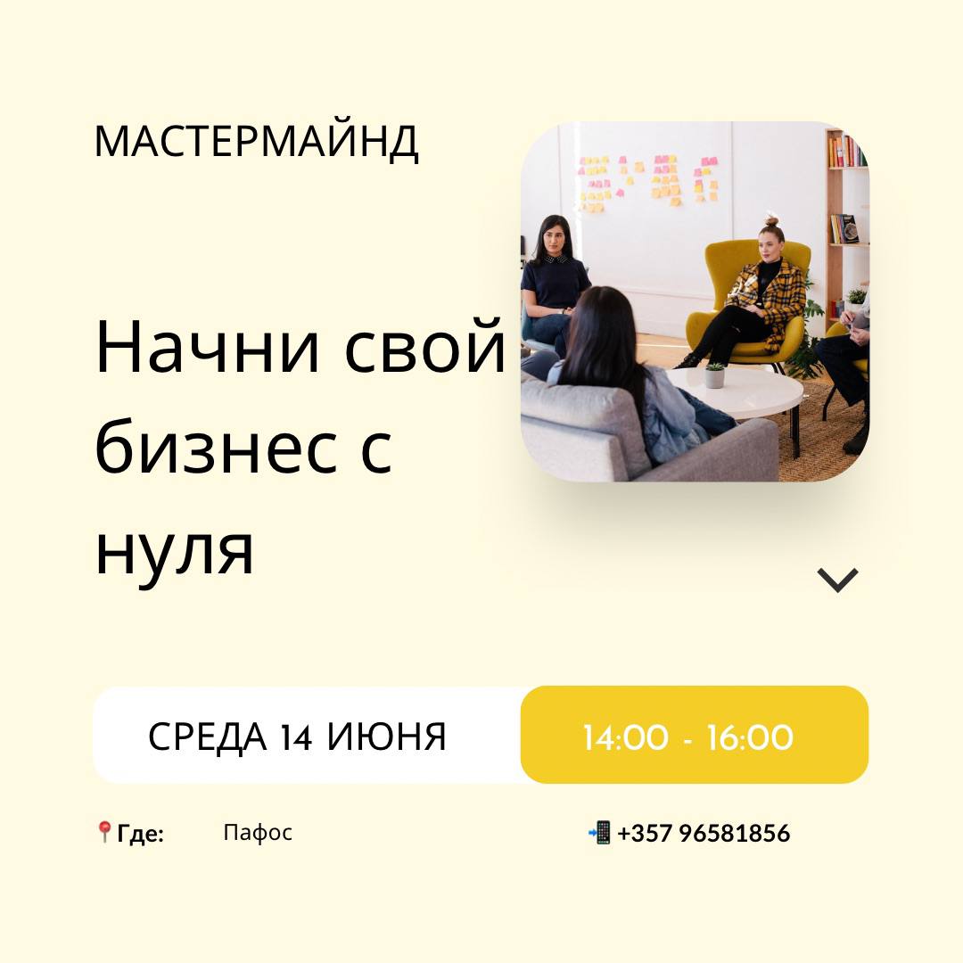 👥 Приглашаем вас присоединиться к нашей встрече Mastermind группы “Начни свой бизнес с нуля”, которая состоится 📆 14 июня с 14:00 до 16:00 📍в Пафосе.