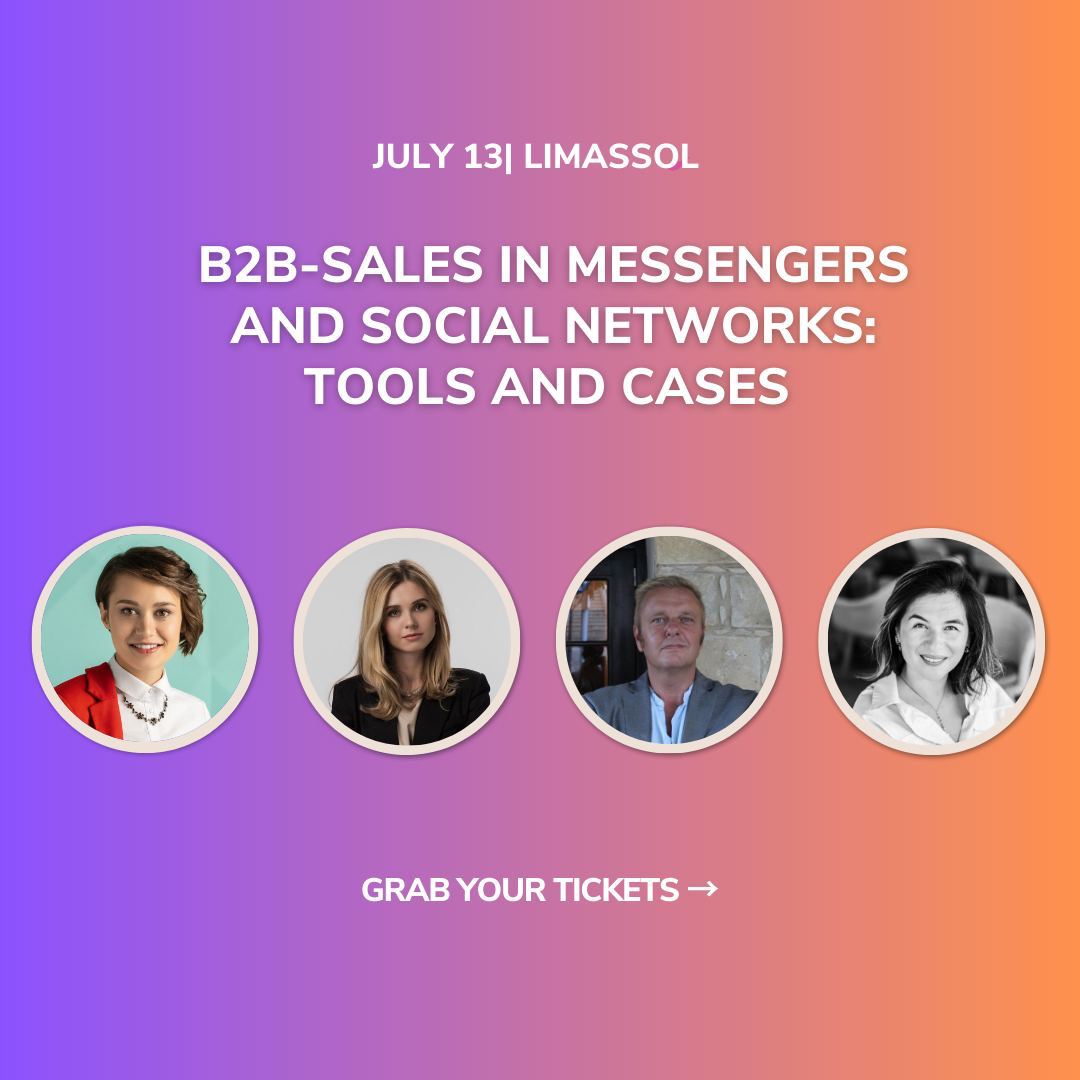 13 июля в 19.00 Entire VC Hall в Лимассоле пройдет мини-конференция «B2B-продажи в мессенджерах и социальных сетях: инструменты и кейсы». Конференция будет проводиться на английском языке.