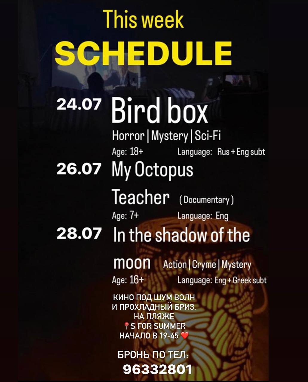 Кино под открытым небом возле моря, что может быть лучше? Уже сегодня мы смотрим Птичий короб, в среду My Octopus Teacher и в пятницу In the shadow of the moon. Стоимость 25 евро ( это депозит на напитки в нашем баре) у нас есть кальян. До встречи на пляже 📍S For Summer на кинопоказе🍿 🎥 . Телефон для брони 96332801.
