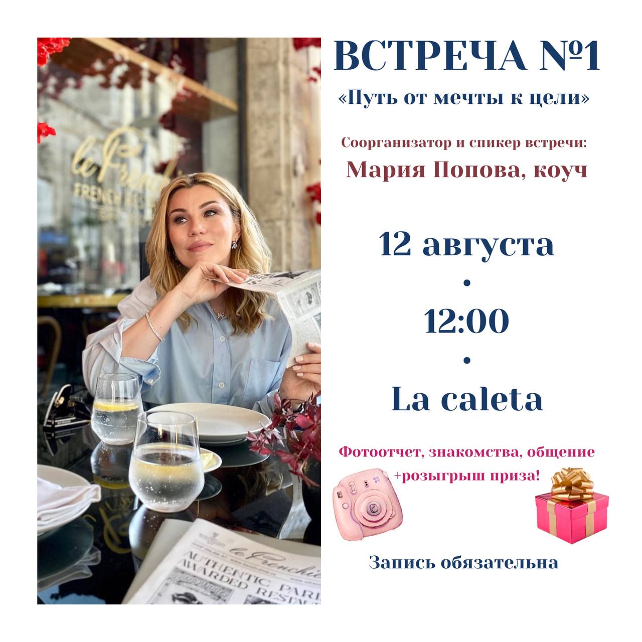 12 августа в 12:00 в видовом ресторане La Caleta произойдёт первая встреча! Мы проведем бранч, темой которого станет МЕЧТА. А точнее, реализация мечты через постановку целей.
