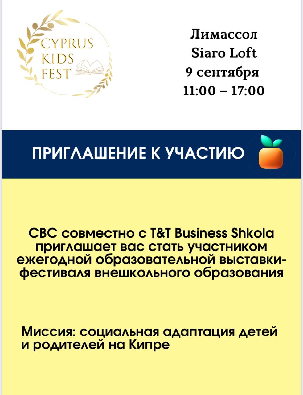 📣9 сентября в честь нового учебного года бизнес-клуб CBC совместно с T&T Вusiness Shkola организовывают I ежегодный образовательный фестиваль на Кипре “Cyprus Kids Fest”