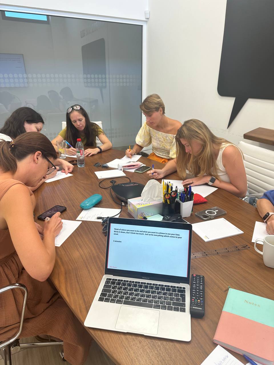 На фото завершающий этап урока. Студенты описывают свою жизнь, какой они ее видят через год. Они еще не знают, что когда допишут, я скажу, что надо представить, что они всего этого достигли за пол года. И теперь им надо написать своих желаниях и мечтах из той точки, которую они уже достигли. А в третьем раунде опять скажу, что и второй список она уже реализовали, пишите, что теперь хотите и как видите вашу жизнь.