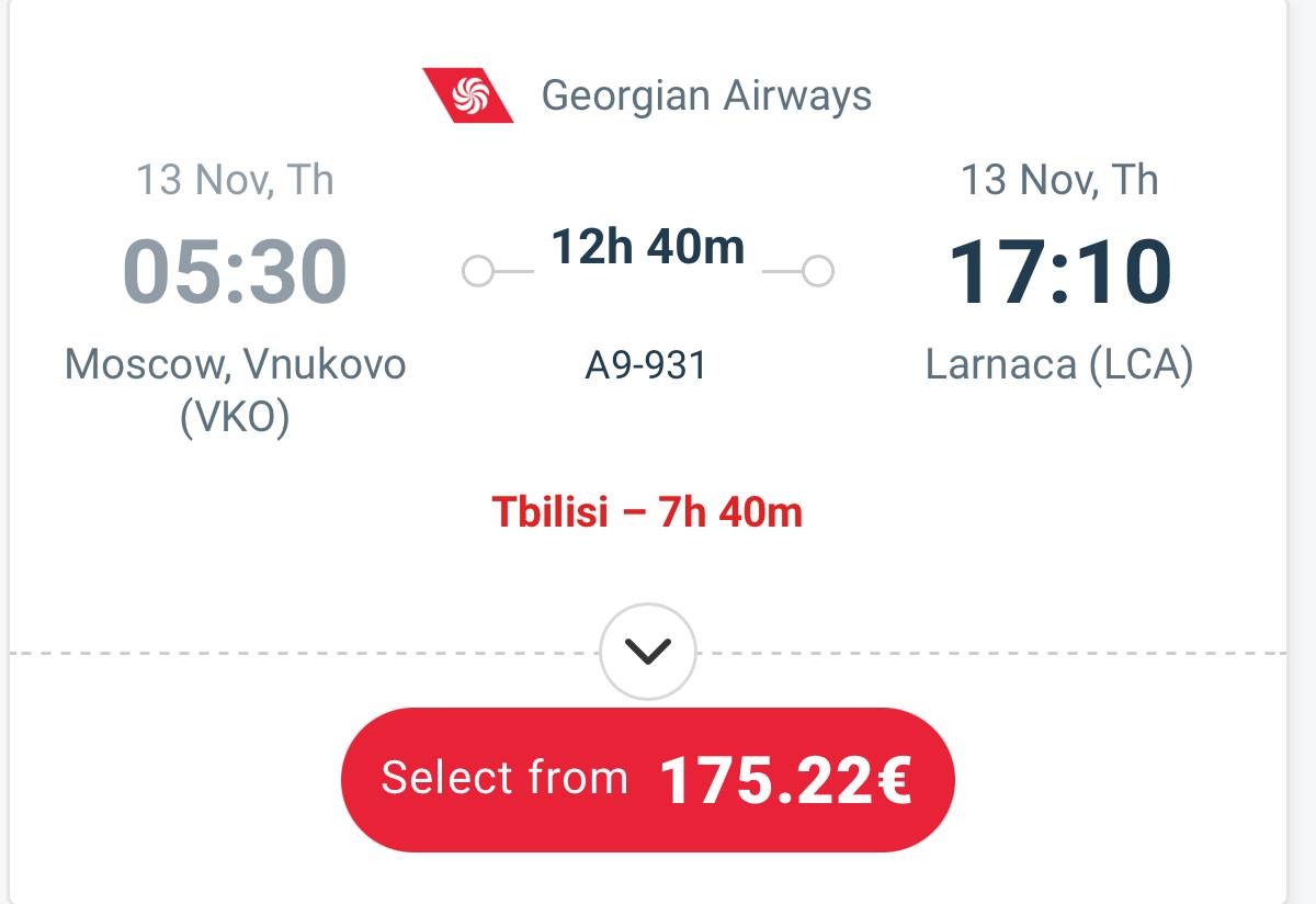 из Ларнаки в Москву 30 ноября за 240€ также через Тбилиси с багажом.