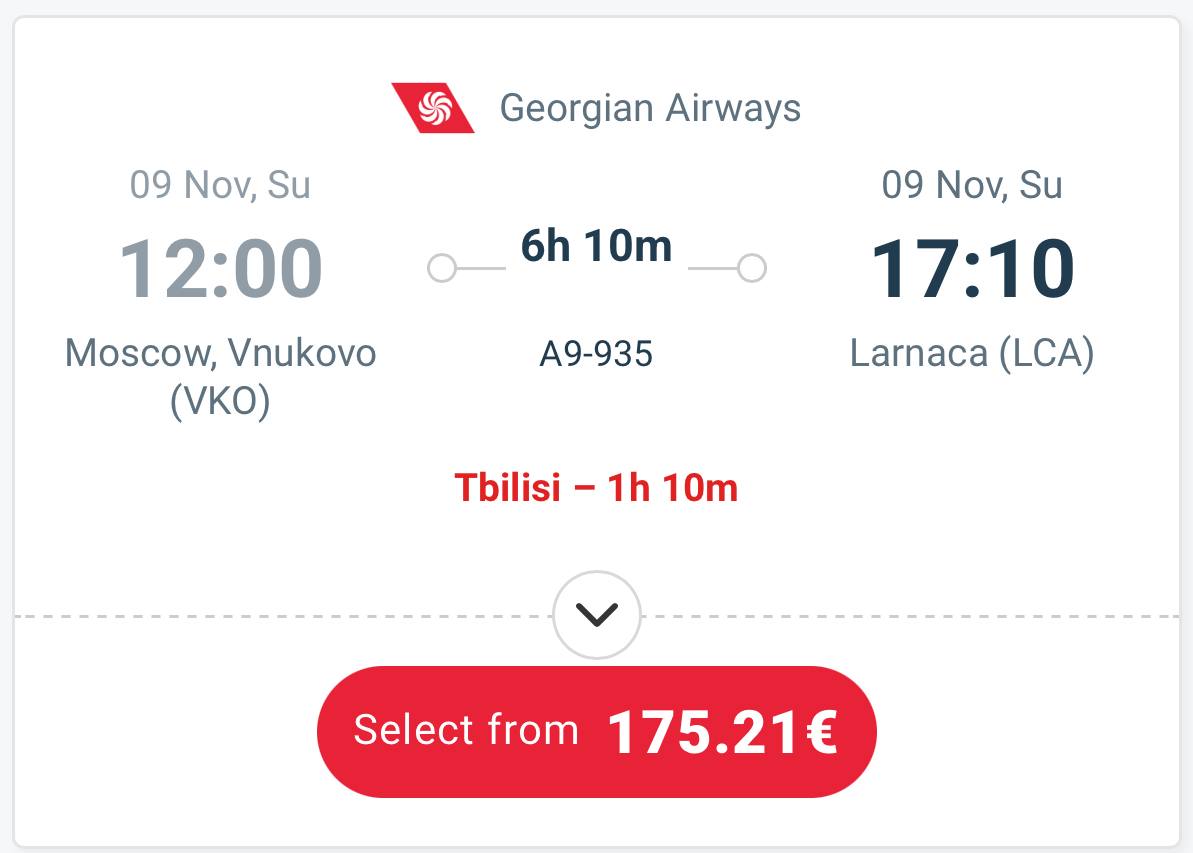 из Москвы в Ларнаку за 175€ (пересадка в Тбилиси, багаж включен). По такой цене есть билеты на 3, 4, 5, 6 и 9 ноября.
