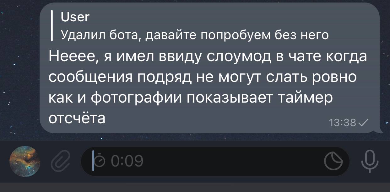 Нееее, я имел ввиду слоумод в чате когда сообщения подряд не могут слать ровно как и фотографии показывает таймер отсчёта