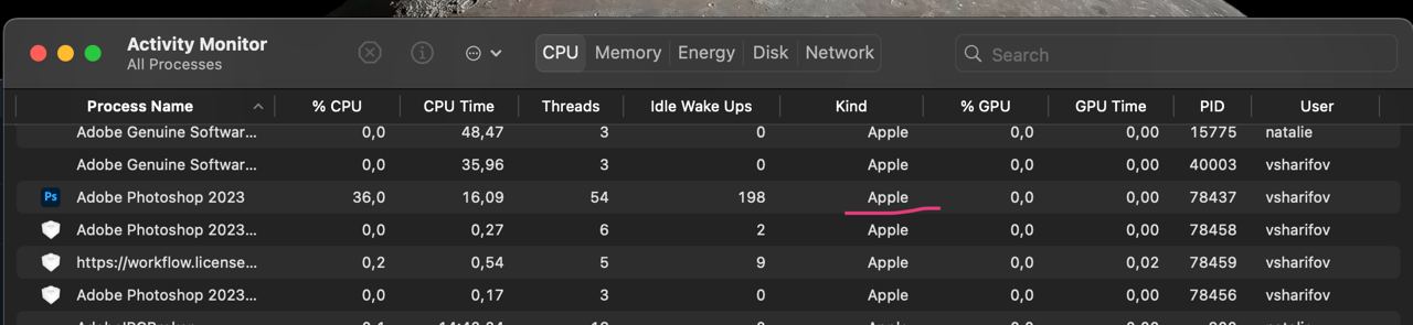 А сам фотошоп в activity monitor запущен как какой процесс? Arm или intel?