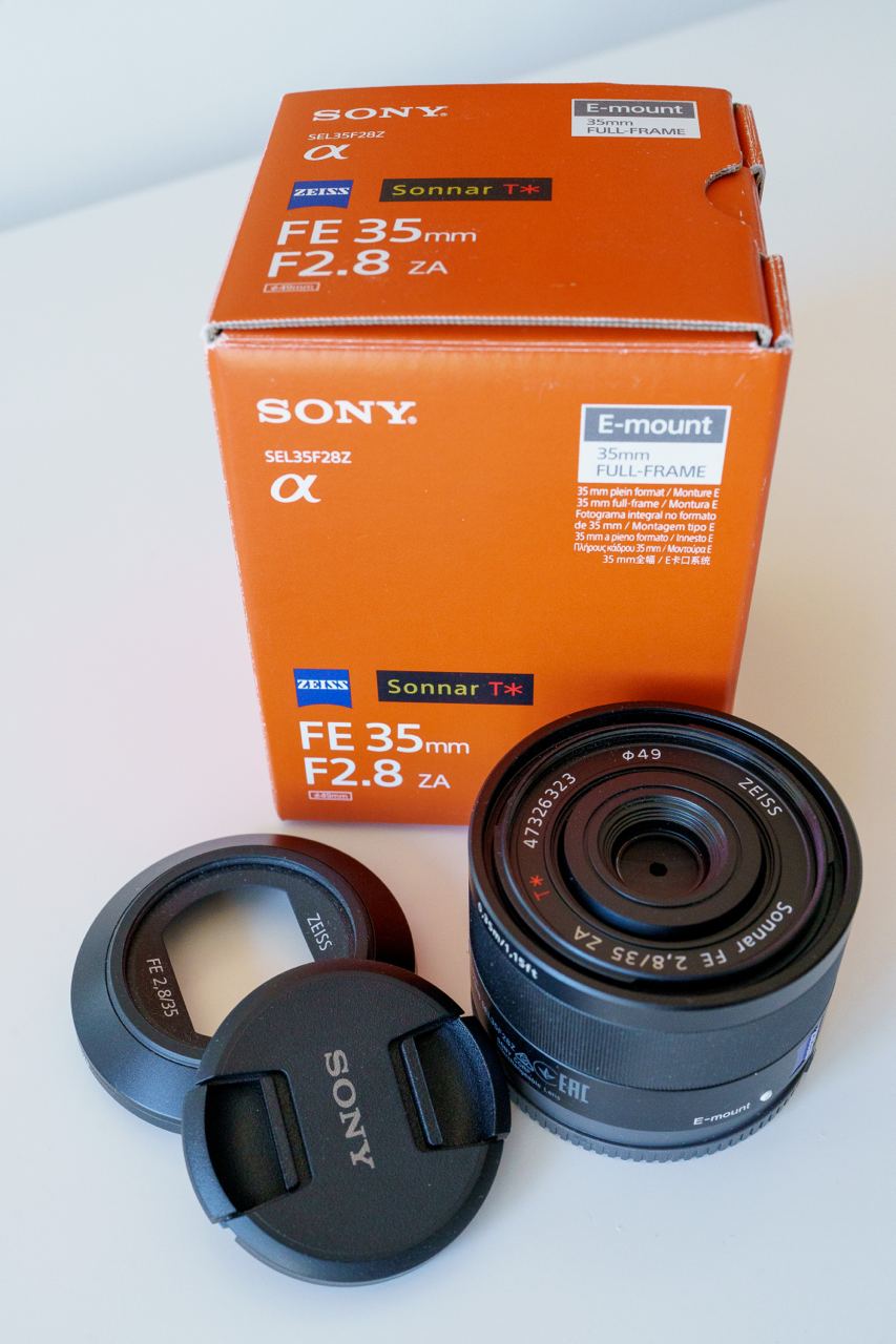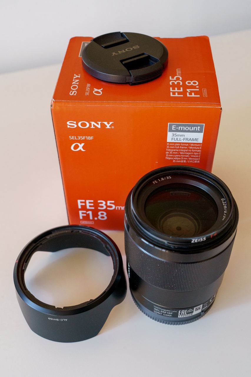 Sony 35mm F1.8 (SEL35F18F) под UV-фильтром Zeiss. Куплен в 2022 году новым. Отличное репортажное стекло, резкое и светлое с портретной диафрагмой 1.8. Видеографы тоже его любят, потому что нет "focus breathing". 450€ вместе с фильтром