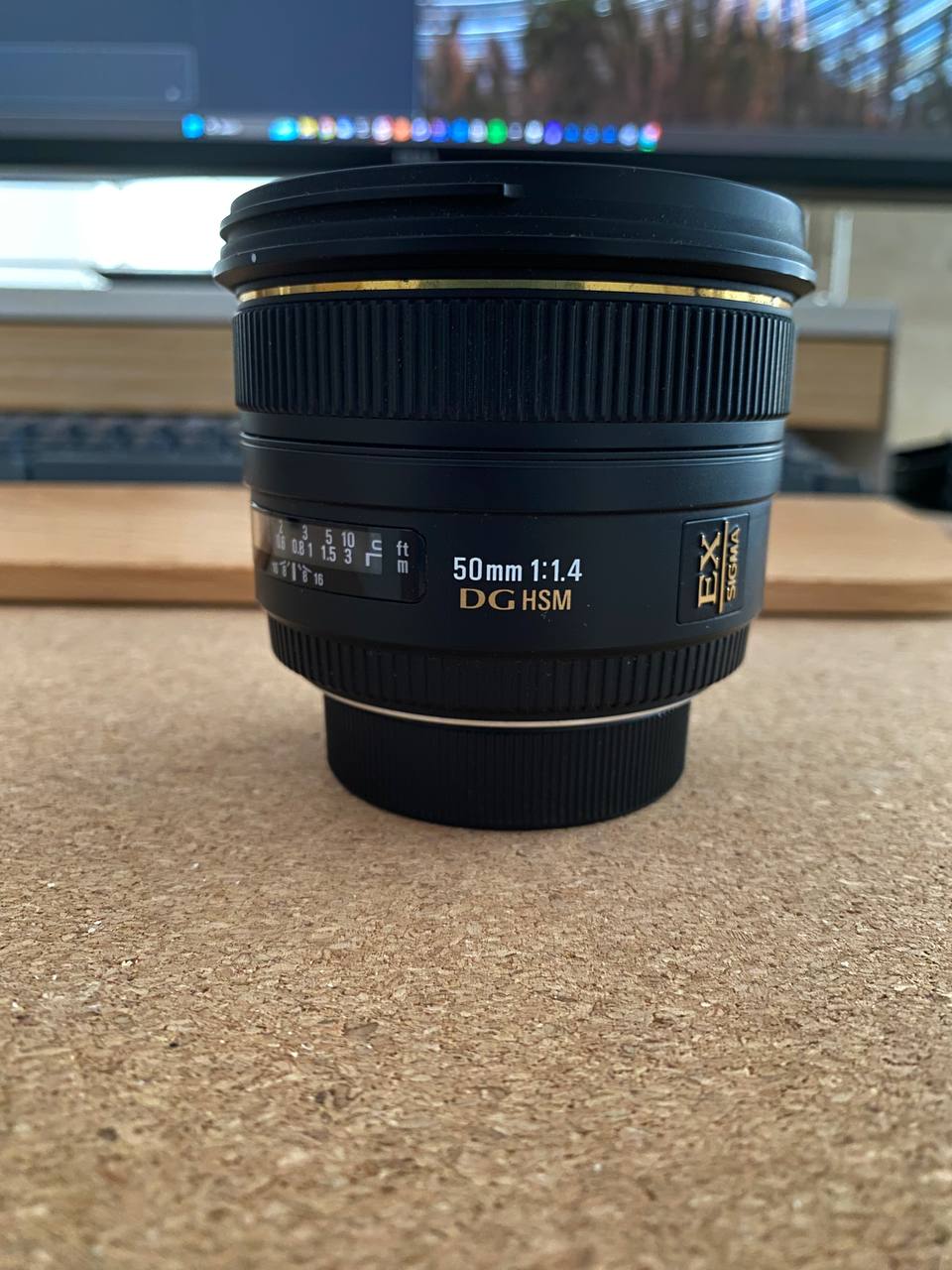 Есть еще один не используемый объектив. Полтинник с огромной передней линзой 77мм, Sigma 50 1.4 DG HSM EX на Nikon F. Из поздних версий поэтому нормальный корпус, а не обшарпанные, которые продаются на eBay. Нет передней крышечки, но есть защитный UV фильтр. 150e