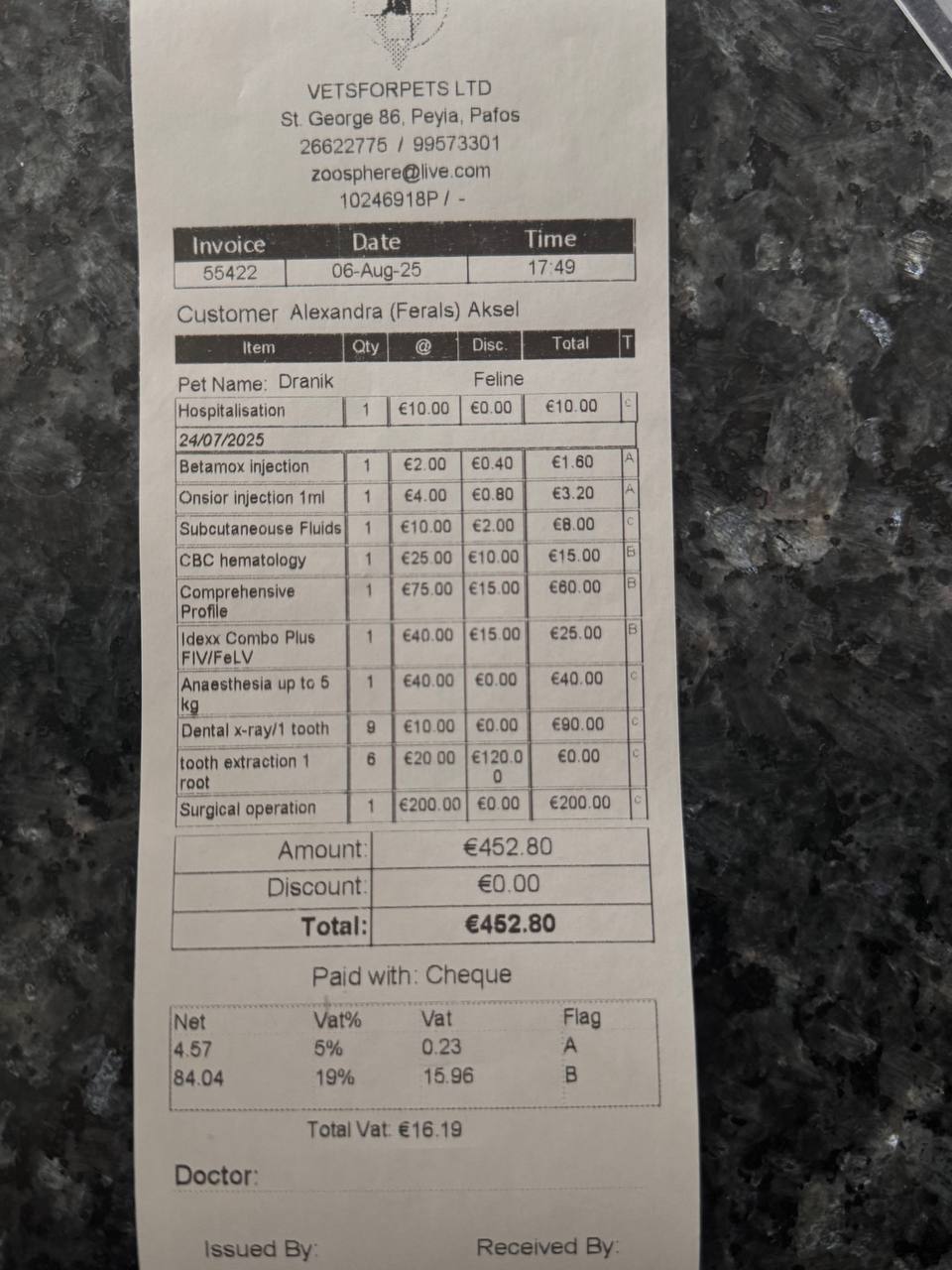 Остаток 382, но это суммы на 06.08, будет больше:( Плюс возможно нужно будет удалить еще зубы, когда котик окрепнет.