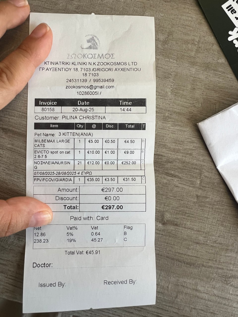 Прилагаю фото котят а также эстимейт чек на 297 евро на первые 3 недели лечения + содержания малышей в зоокосмос