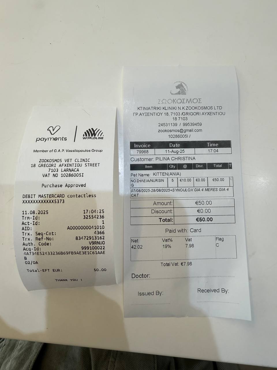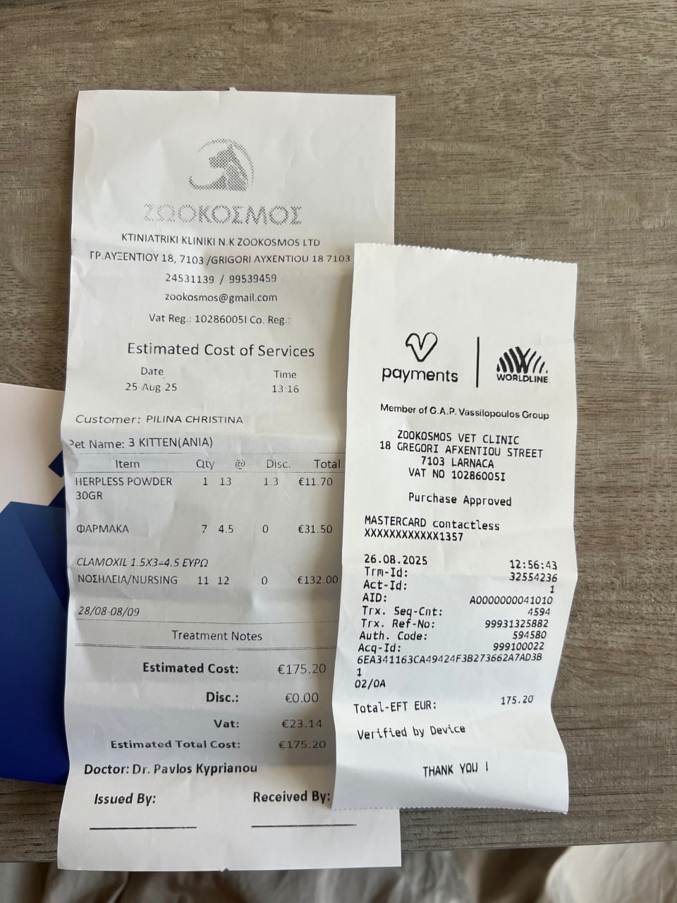 Врачи в Зоокосмосе - тоже просто душки! Наталья и ее команда обещали заботиться о малышах, регулярно промывать, прокапывать и промазывать глазки, давать противовирусную терапию... Я очень надеюсь, что благодаря всем неравнодушным людям - у котят появился шанс. Но загадывать пока рано💔 До понедельника-вторника будем наблюдать, во вторник, если получится, организуем визит пациентов к офтальмологу Гликерии в Ларнаке ❤️ - надеемся на хороший прогресс к этому времени и благоприятный прогноз у доктора🙏) Лечение котят будет долгим, и скорее всего, дорогим. На текущий день по очень скромному эстимейту, со стороны клиники, содержание/госпитализация котят до 28/08 + курс лечения + тройной тест + антибиотики/витамины, эстимейт выходит 297 + я думаю расходники корм + наполнитель и тд + визит к офтальмологу. В общем, пока есть только эстимейт на 297 евро, но будет, cкорее всего в районе 500 а то и больше...
