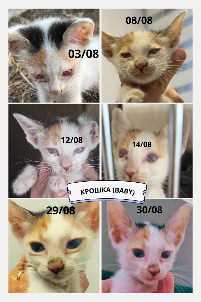 P.P.S.: также, за день до появления в колонии этих ребят, в колонии была подброшена еще одна маленькая девочка, мы точно не знаем, в том же она помете была, или нет, но она также находится в зоокосмосе, в отдельной камере до понедельника, проходит обработку и получает витамины и имуннобустеры (к моменту когда она приехала в клинику, у нее был красненький глазик один, решили оставить в клинике прокапать несколько дней и наблюдать) . Эстимейта на ее лечение пока нет, но ожидаем в районе 70 евро за несколько дней, дальше будем решать, что с ней делать - появился малюсенький шанс ее пристроить, будем надеяться что все получится.