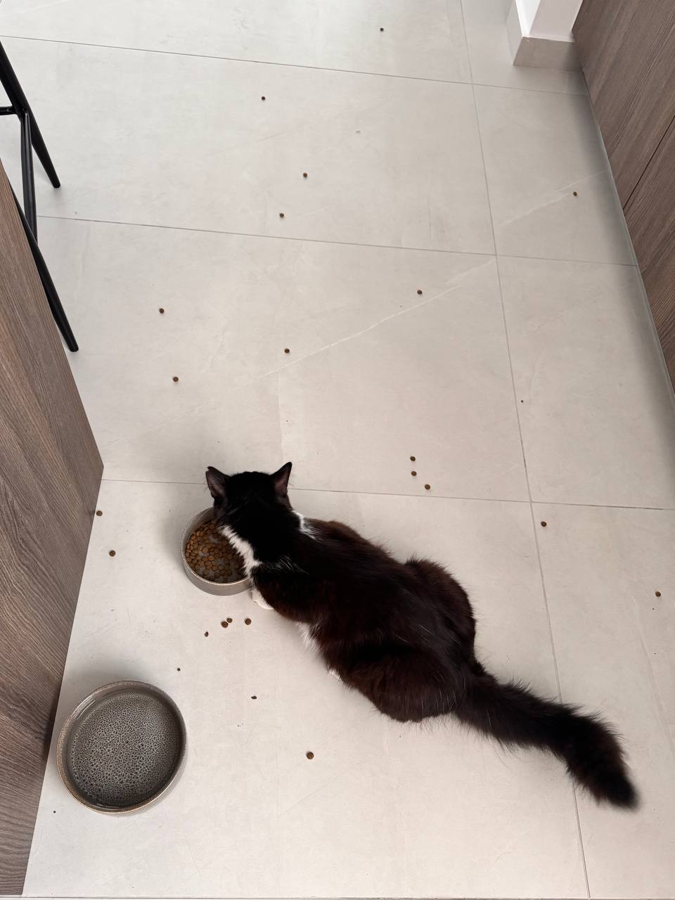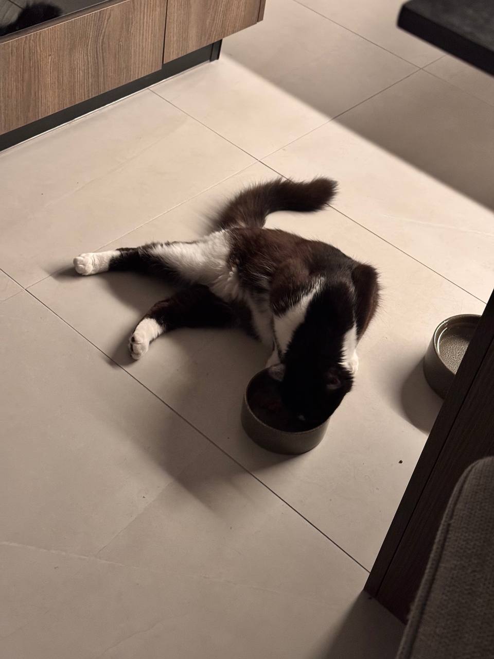 Марина, ей собака попу вылизывает и кондиционера хватает 😂 просто впервые вижу кошку, которая лежа в миске ест и еду разбрасывает вокруг