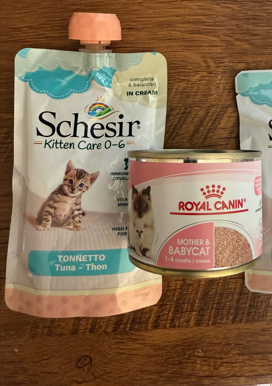 Лучше молочком специальным. Но и детский паштет можно давать, есть у Шезир для котят с рождения