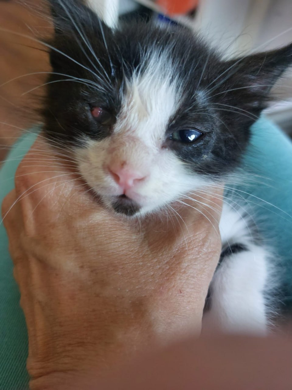 У котят плохие глазки: у Черных плохие, но поддаются лечению, у бежевого и трёх цветки - плохие, но есть надежда на частичное зрение, у черно-белого оказалась совсем беда: один глаз на следующие пару дней раздуло как теннисный шарик, не помогало никакое лечение, пришлось рискнуть и котенку 300 гр сделать микрохирургическую манипуляцию под газом-анестетиком. Это временное решение, когда котенок подрастет, нужна будет нормальная опрерация.