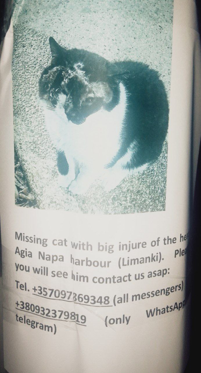 Здравствуйте. Я турист. Ищу местных жителей/волонтёров в Айа Напе, кто поможет словить кота с разбитой головой на набережной. Сегодня два часа назад встретила его. Сразу отвечу: словить не смогла, он близко не подходит, очень боится, он поел влажный корм вдали, потом получилось подойти чуть ближе сфотографировать, похоже его ударило двуногое существо.