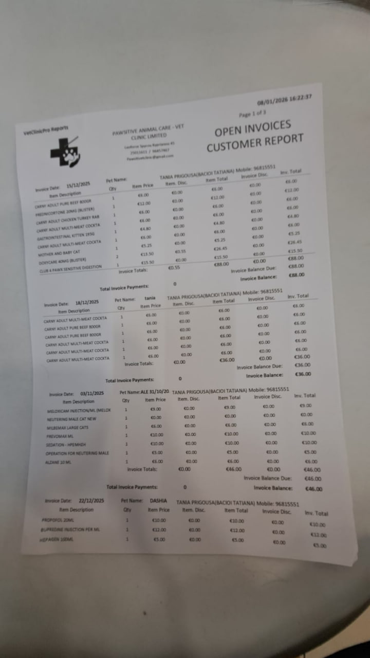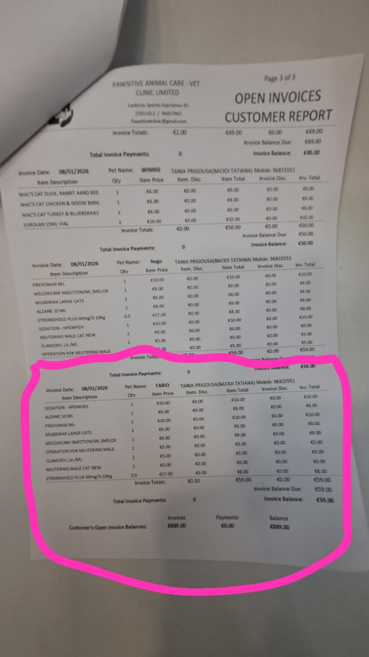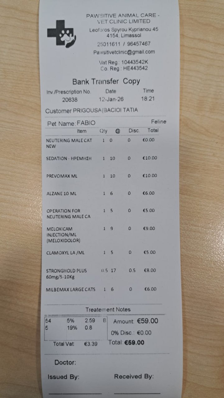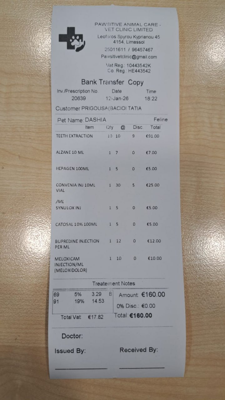 Прикладываю эстимейт на кошку Дашу - уличную кошку, появившуюсья рядом с работой Тани. Ей около 7 лет, и как часто бывает на Кипре, ей стало больно есть, ее отвезли в клинику - и выяснили, что у кошки плохие зубы, удалили 10 зубов, кошечка стабильна.