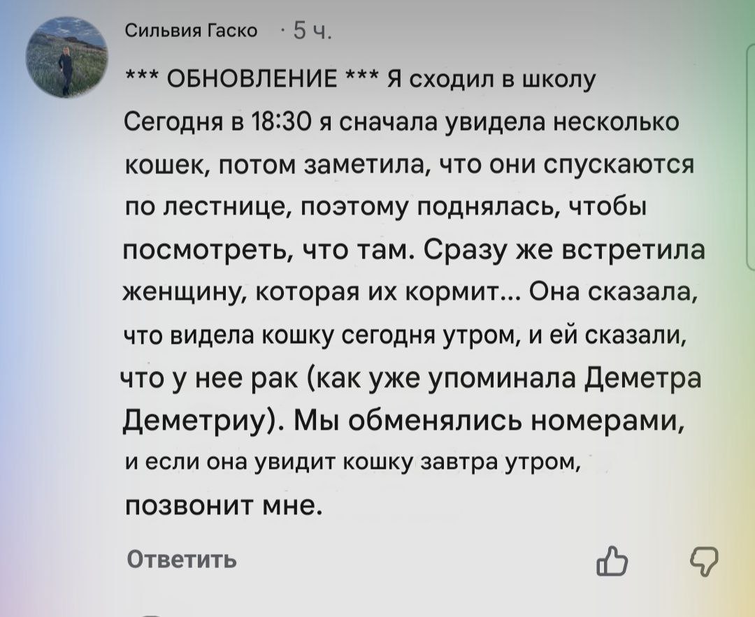 В этой локации кот с разодранной (?) мордой, не успела заскринить, дурацкий фб сбросил. Рыжий большой кот.