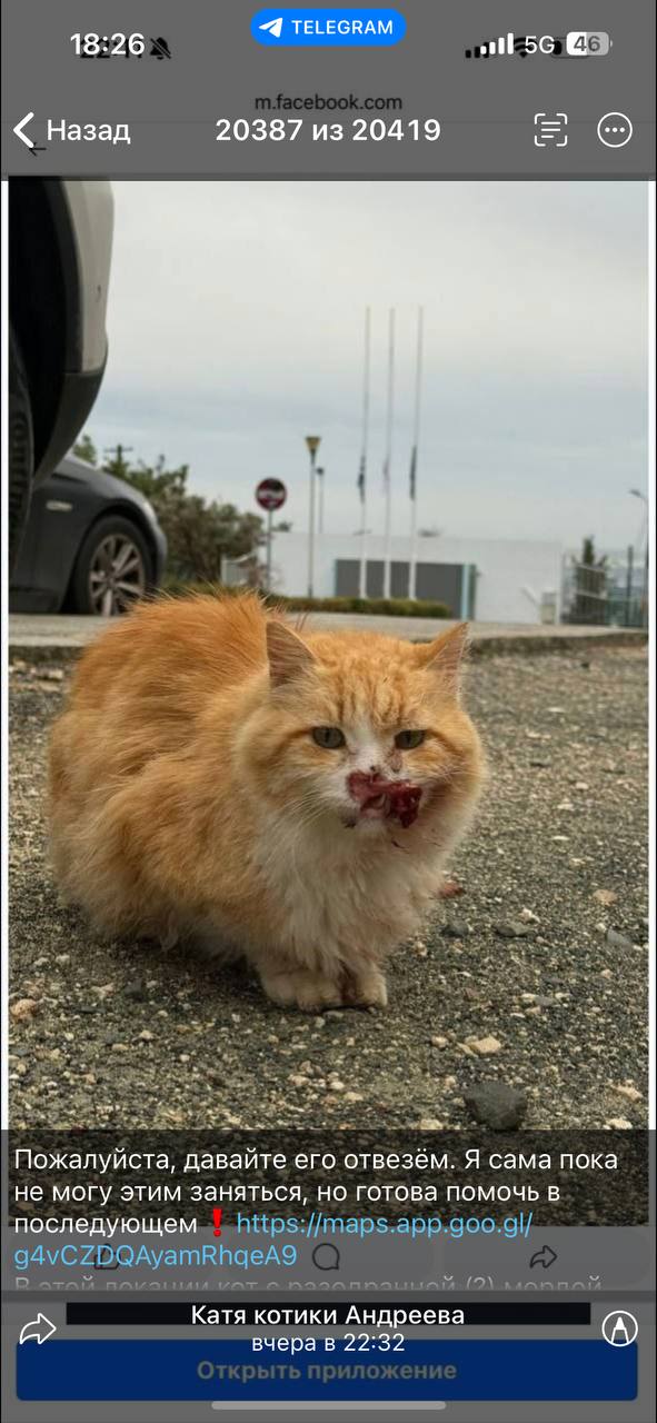 @MaraJadeSПодскажите, нашёлся ли тот котик, рыжий в Лимасоле с травмой мордочки?