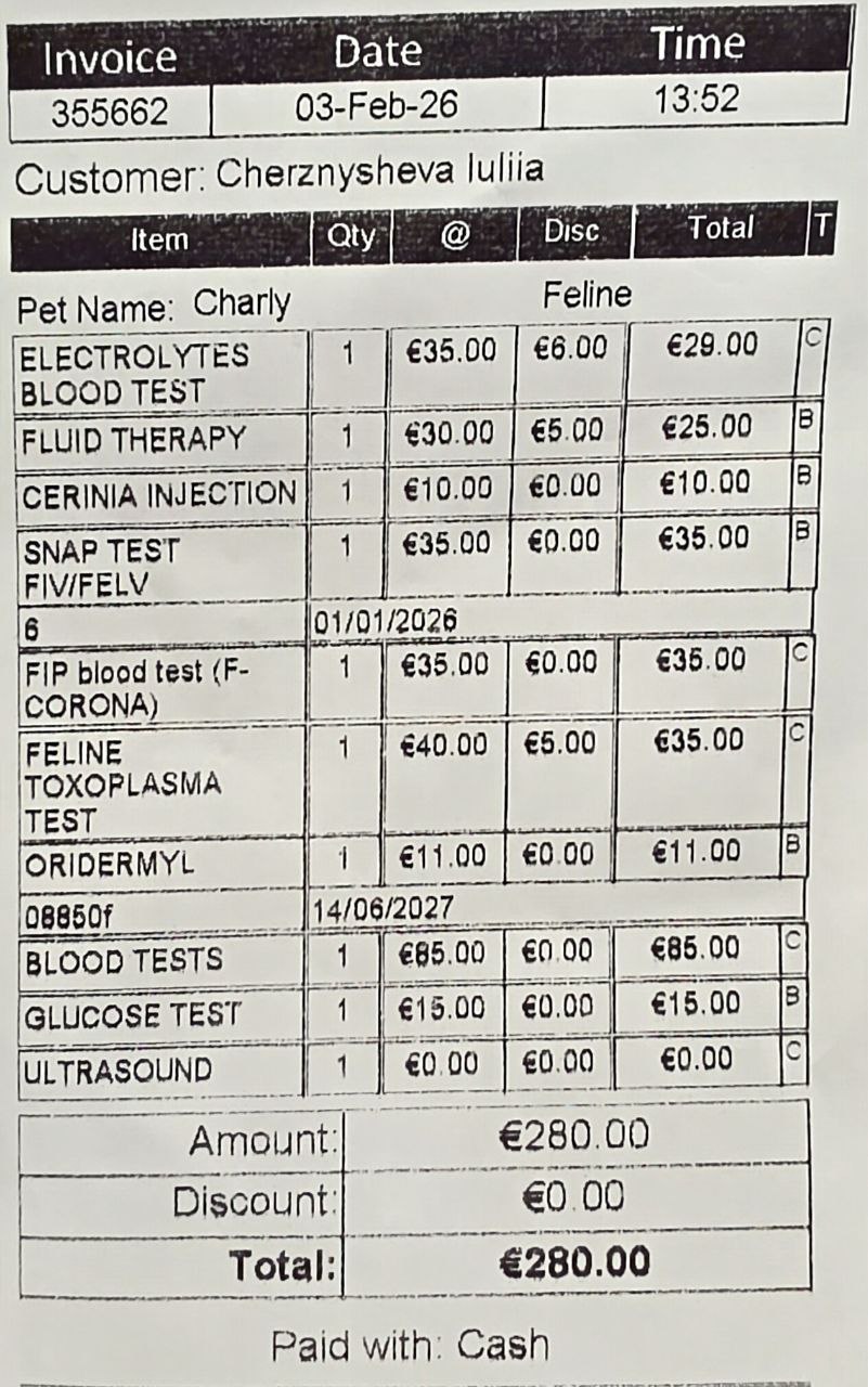Пока я заплатила только за анализы и за предыдущий эмёрдженси визит в другой клинике - это €280 + €215.4 = €495.4