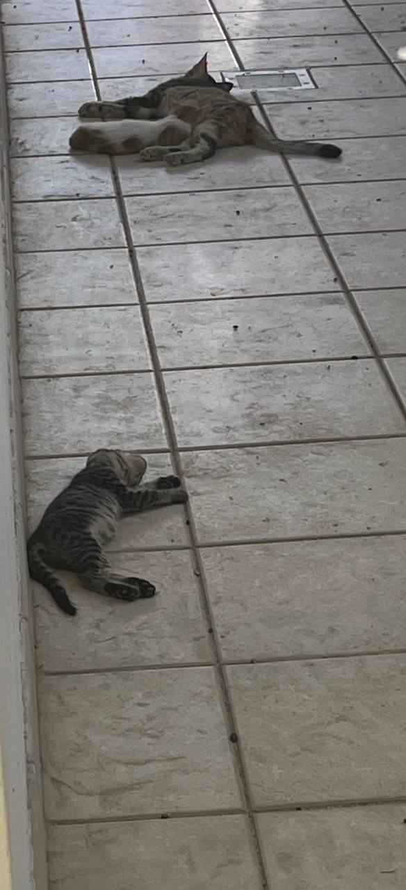 Мама кошка и 2 котенка, которые всегда с мамой, спят на ней и пьют ее молоко, с территории вообще никуда не уходят, ни мама ни котята