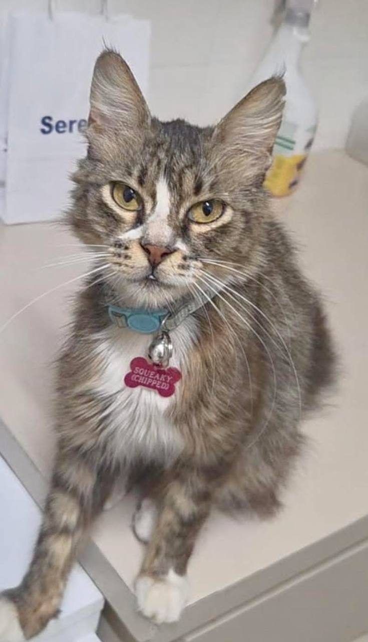 Hello everyone. This is Squeaky. She is a sterilised, microchipped female cat wearing a collar with a name tag. She was last seen near the Kato Paphos cemetery, above Bar Street, next to the Pop Life supermarket. If you see her, please call us immediately at 97775982.