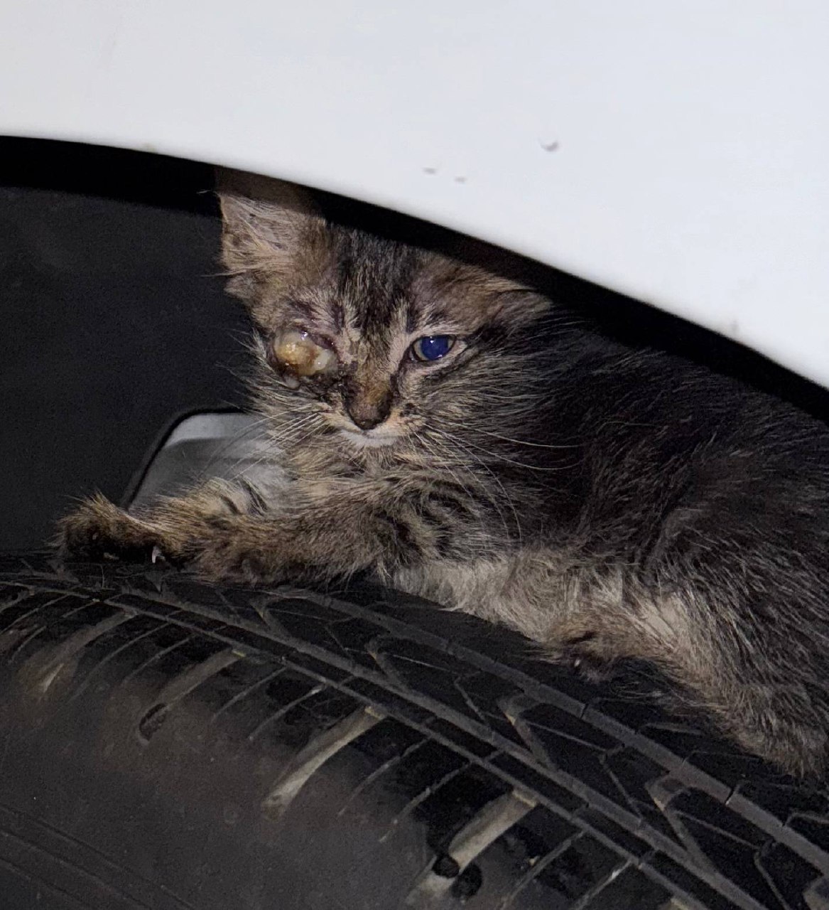 Нашли котёнка, прячется на колесе машины. Состояние очень плохое, глаз сильно воспалён.