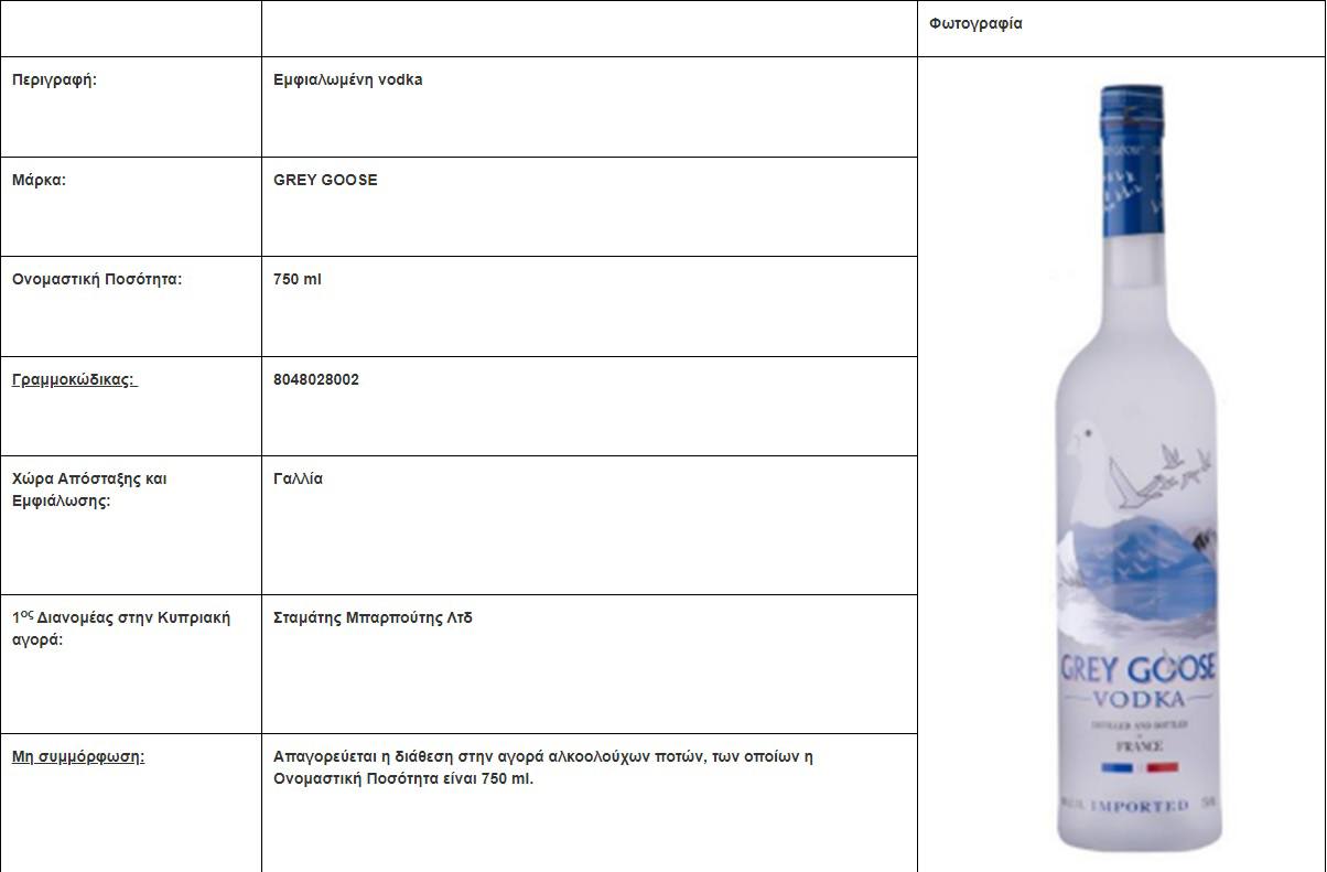 🔊 Служба мер и станций Министерства энергетики Кипра изъяла с рынка водку Grey Goose (750 мл, штрих-код 8048028002, произведенную во Франции) из-за нарушения постановления, запрещающего продажу алкоголя такого объема. Дистрибьютором на Кипре является Stamatis Barboutis Ltd, а продукция снята с продажи.