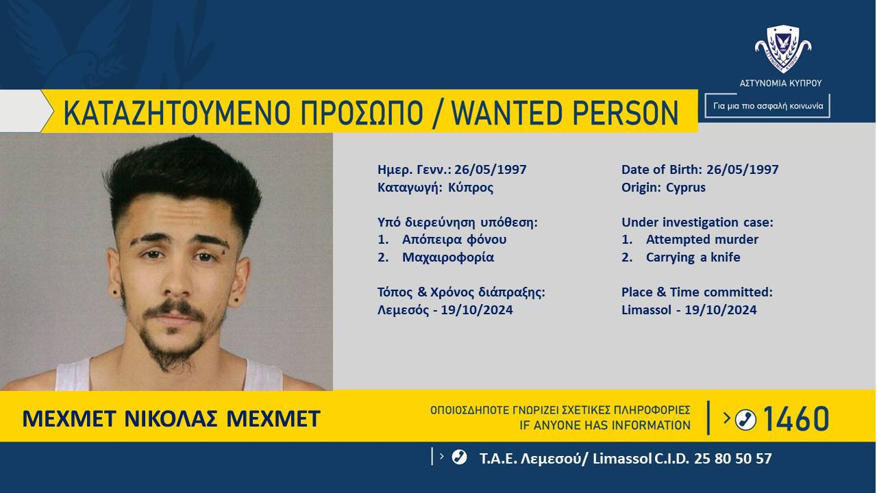 🔊 Полиция Кипра разыскивает 27-летнего Мехмета Николаса Мехмета по подозрению в покушении на убийство (ножевое ранение) в Лимассоле.