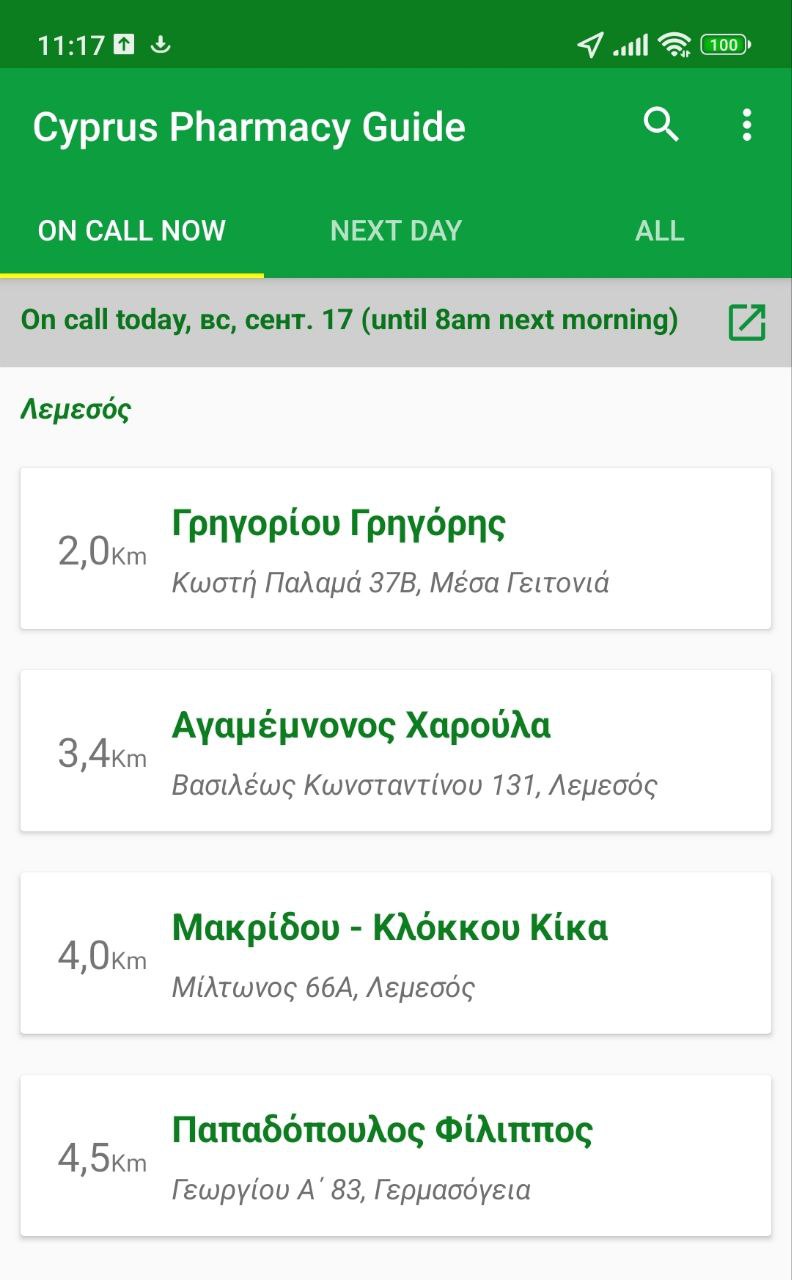 Вот эти аптеки должны быть открыты сейчас. Наверху есть название приложения "Cyprus Pharmacy Guide", там пишут название открытых сейчас аптек. Приложение покажет ближайшие к вам аптеки
