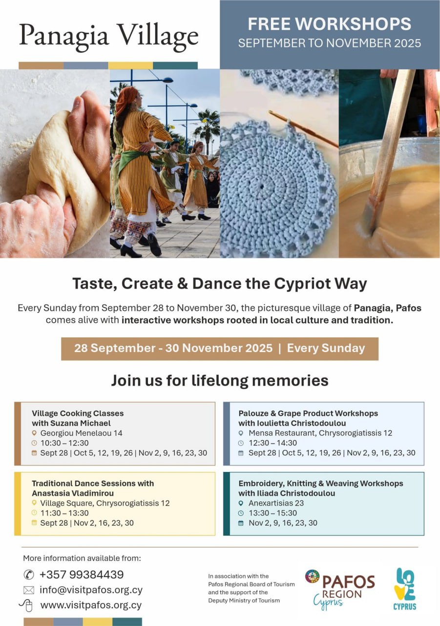 По воскресеньям до 30 ноября в деревне Панайя (примерно 35 км от Пафоса) продолжаются бесплатные мастер-классы “Кипрские традиции” Taste, Create & Dance the Cypriot Way