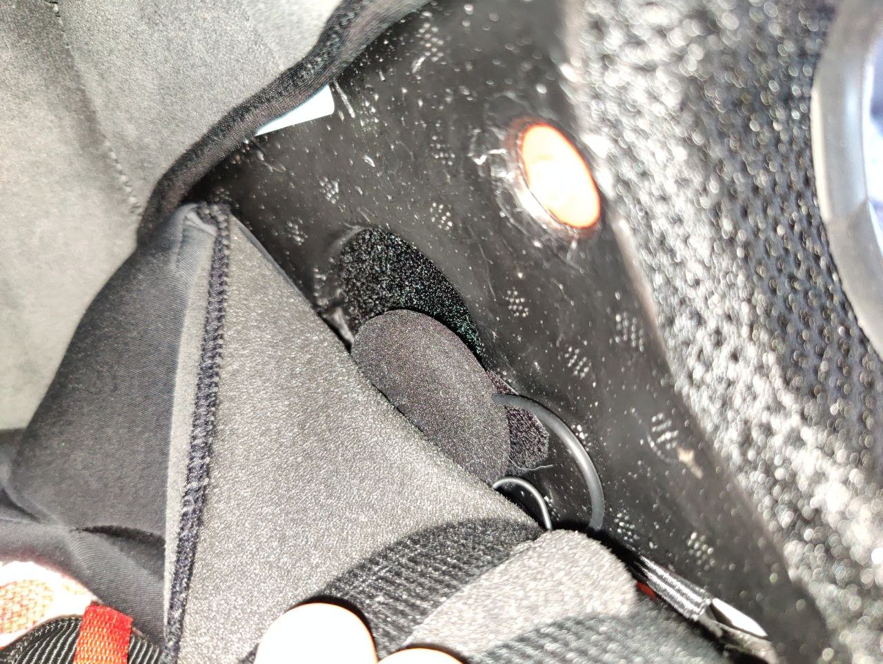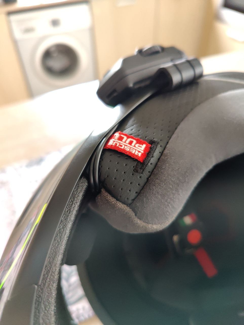 С Shark Spartan Carbon двойки всё проще вышло - там и прищепка до конца плотно вошла (под скотч опять же не нашёл подходяшего места), вырезы под уши в нужных местах, провода чуть проще уложил.