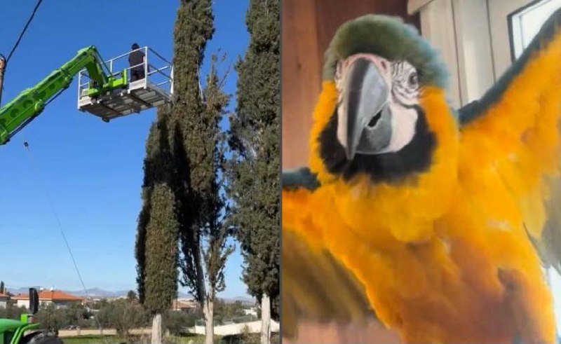Процесс спасения домашнего попугая попал в объектив фотографа-любителя. В операции участвовала телескопическая платформа, которую пришлось вызвать хозяину птицы.
