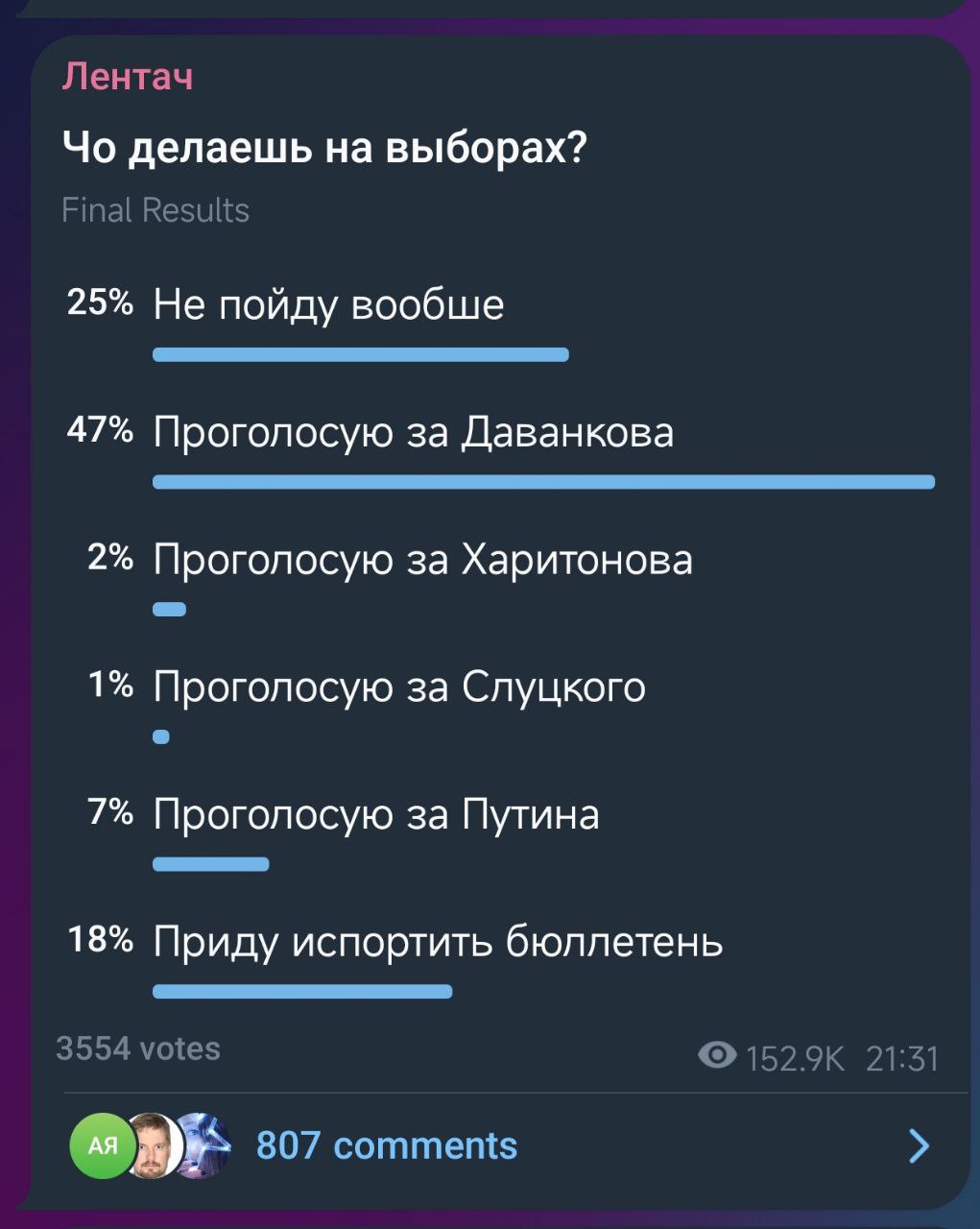 Опрос, проходящий на сайте таком-то, показал, что 100% пользователей пользуются интернетом :) какие ещё результаты ожидать от 1) телеграмм-канала 2) Лентач? :)