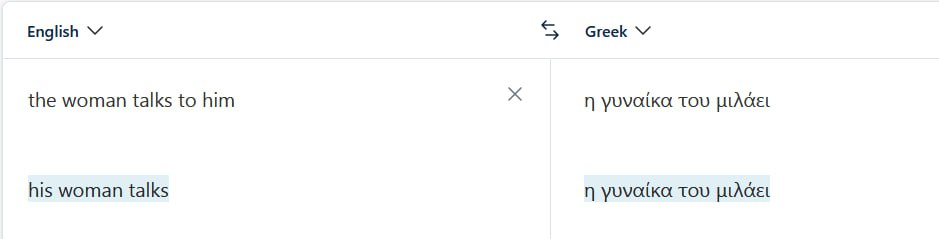 Кто уже более-менее умеет греческий? Это правильный перевод? Я думал, это "его женщина говорит", а "ему женщина говорит" будет "του μιλάει η γυναίκα". Не так?
